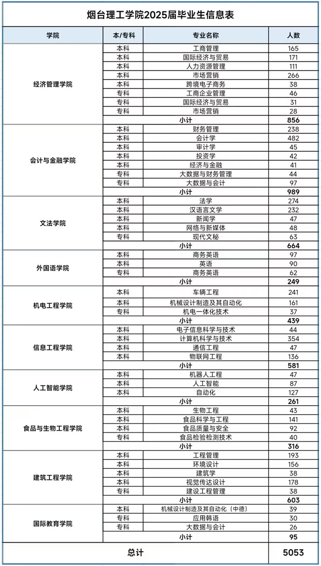 烟台理工学院2025届毕业生共5053人,详情见下图: