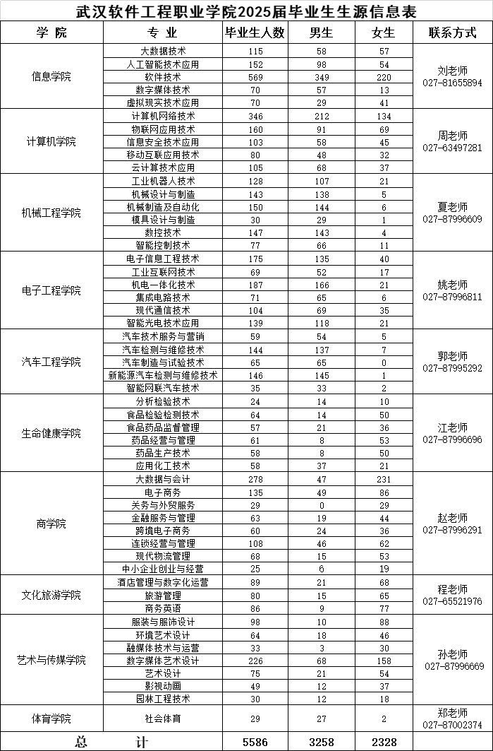 武汉软件工程职业学院2026届生源信息 链接:武汉软件工程职业学院2026届生源信息 武汉软件工程职业学院2025届毕业生共5586人,其中,女生2328人,男生3258人,详情见下图: 推荐阅读武汉软件工程职业学院就业指导中心联系方式湖北生源信息查询系统