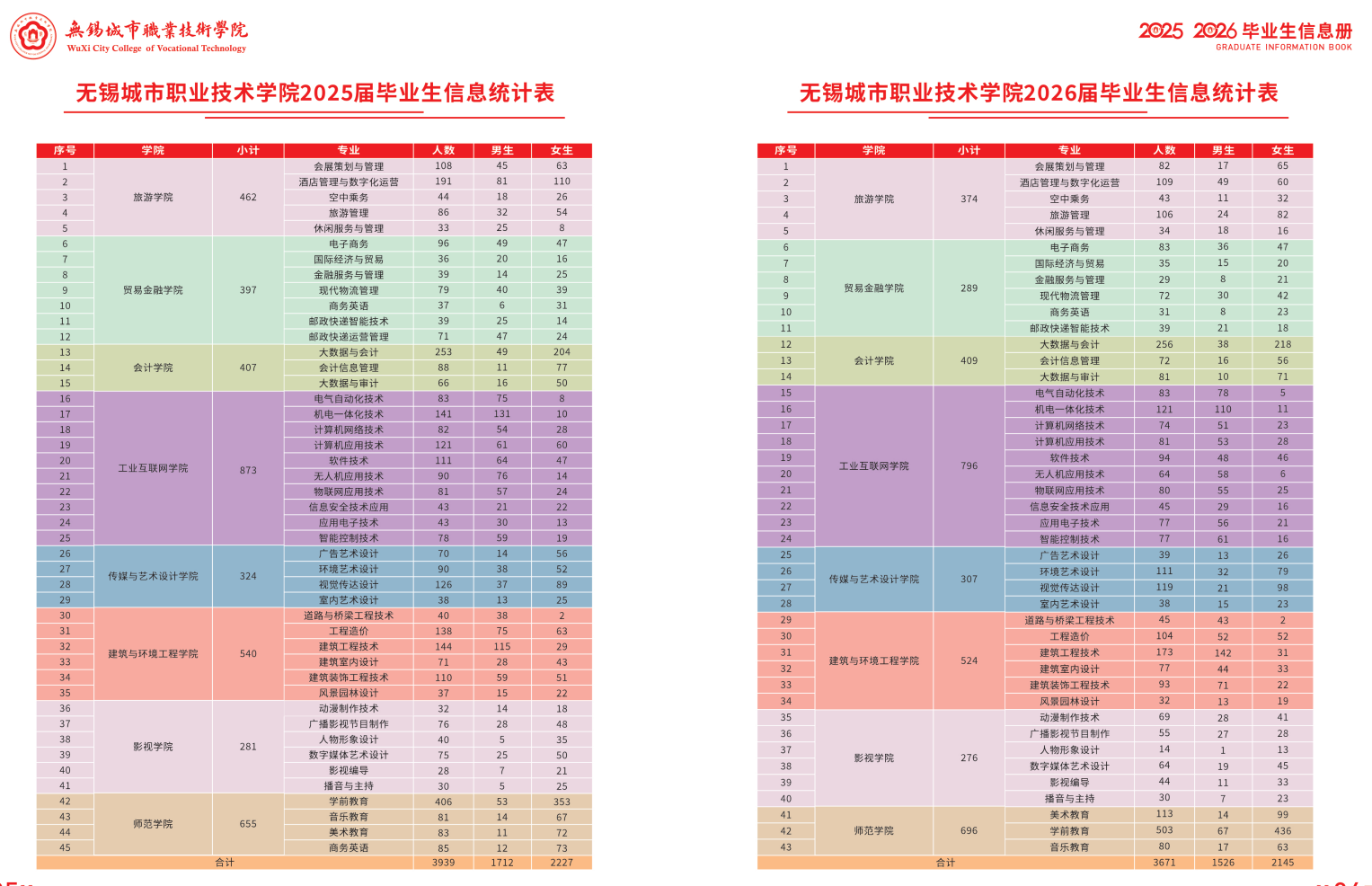 无锡城市职业技术学院2026届生源信息 无锡城市职业技术学院2025届毕业生共3939人,2026届毕业生共3671人,详情见附件: 附件:无锡城市职业技术学院2025届-2026届毕业生信息统计表.png 推荐阅读无锡城市职业技术学院就业指导中心联系方式江苏生源信息查询系统