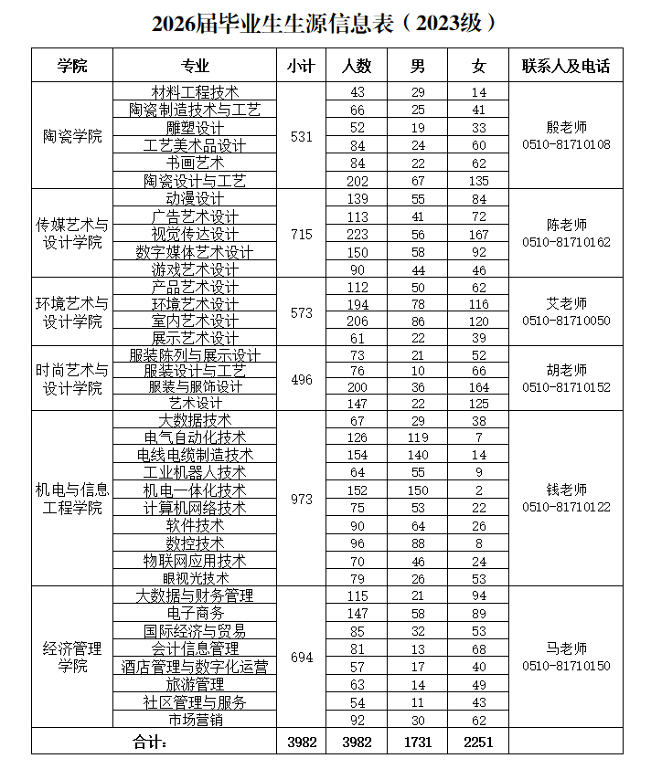无锡工艺职业技术学院2026届生源信息 无锡工艺职业技术学院2026届毕业生共3982人,其中,女生2251人,男生1731人,详情如下: 推荐阅读无锡工艺职业技术学院就业指导中心联系方式 江苏生源信息查询系统