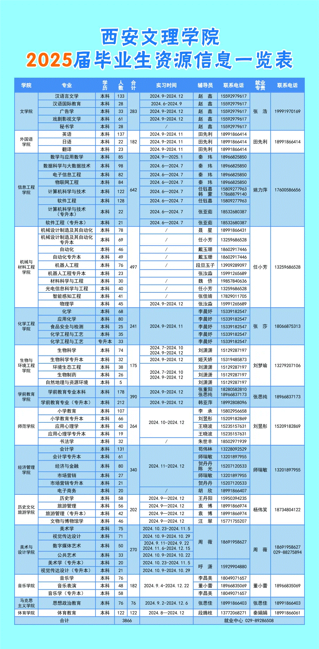 西安文理学院2026届生源信息 西安文理学院2026届毕业生共4130人,详情见下方链接: 链接:西安文理学院2026届生源信息 西安文理学院2025届毕业生共3866人,详情见附件: 附件:西安文理学院2025届毕业生资源信息一览表.gif 推荐阅读西安文理学院就业指导中心联系方式 陕西生源信息查询系统