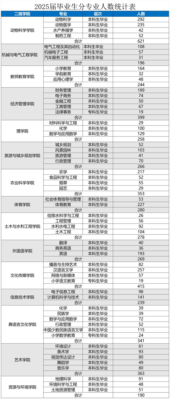 西昌学院2025届毕业生共4712人,详情见下图: