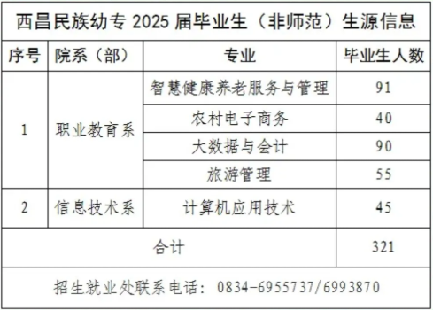 西昌民族幼儿师范高等专科学校2026届生源信息 西昌民族幼儿师范高等专科学校2026届生源信息 西昌民族幼儿师范高等专科学校2025届毕业生共1831人,其中,师范专业毕业生1510人,非师范专业毕业生321人,详情如下: 推荐阅读西昌民族幼儿师范高等专科学校就业指导中心联系方式 四川生源信息查询系统