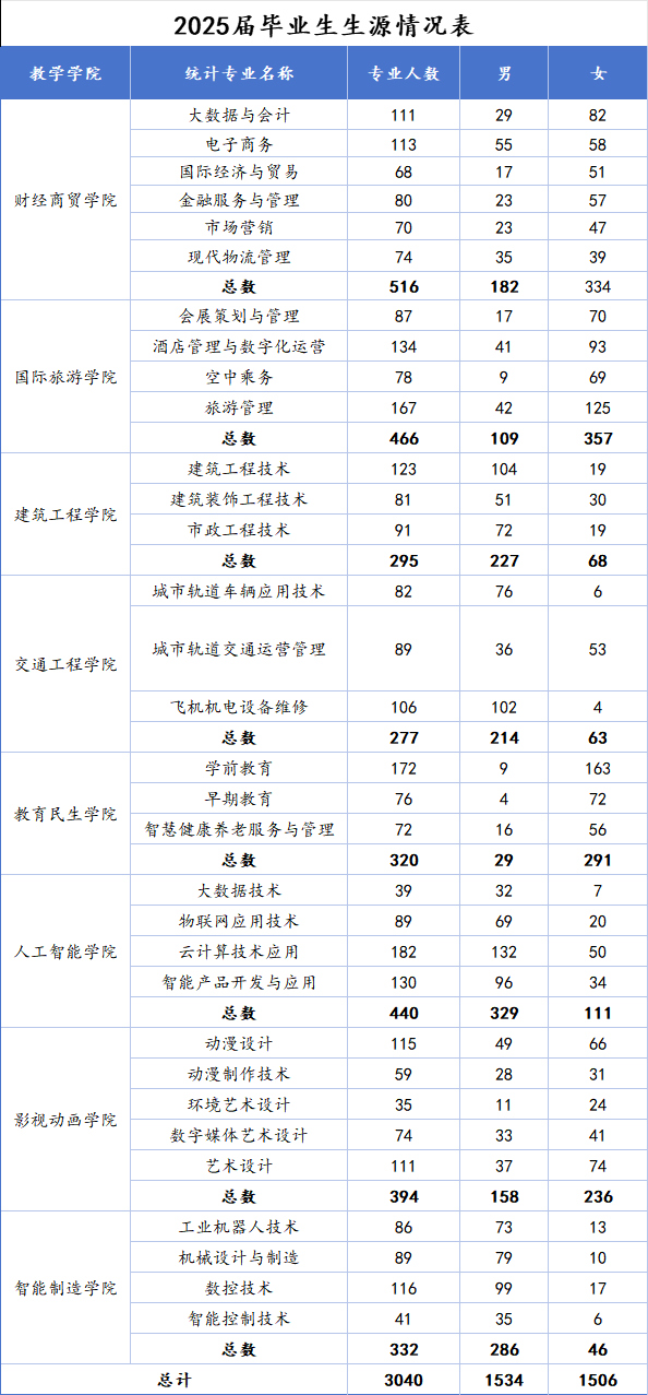 厦门城市职业学院2026届生源信息 厦门城市职业学院2026届毕业生总数预计为2824人,详情见附件: 附件:厦门城市职业学院2026届毕业生专业信息统计表.xlsx 厦门城市职业学院2025届毕业生共3040人,其中,女生1506人,男生1534人,详情见下图: 推荐阅读厦门城市职业学院就业指导中心联系方式 福建生源信息查询系统