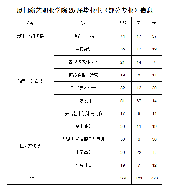 厦门演艺职业学院2025届毕业生共379人,详情见下图:
