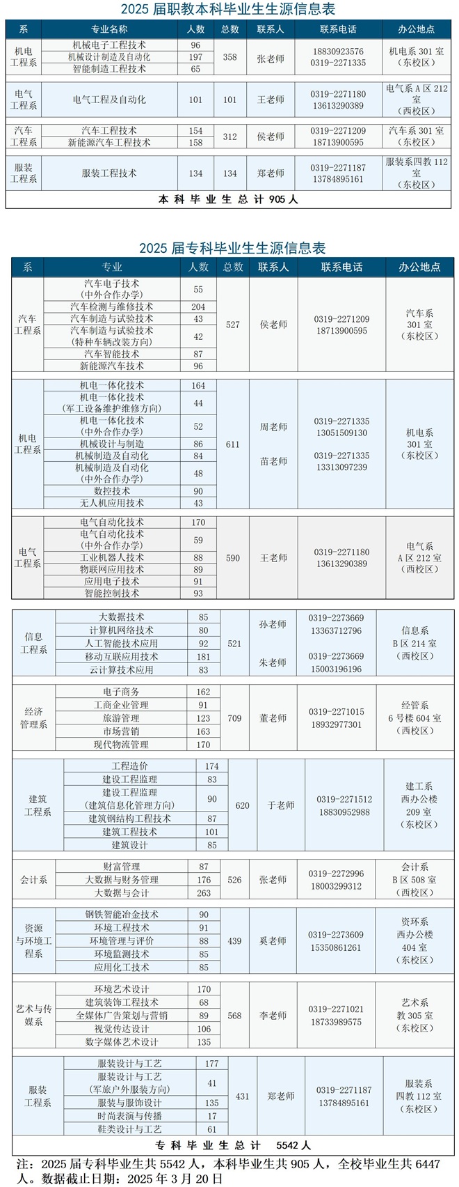 河北科技工程职业技术大学2026届生源信息 链接:河北科技工程职业技术大学2026届生源信息 河北科技工程职业技术大学2025届毕业生共6447人,其中,本科毕业生905人,专科毕业生5542人,详情见下图: 推荐阅读河北科技工程职业技术大学就业指导中心联系方式 河北生源信息查询系统