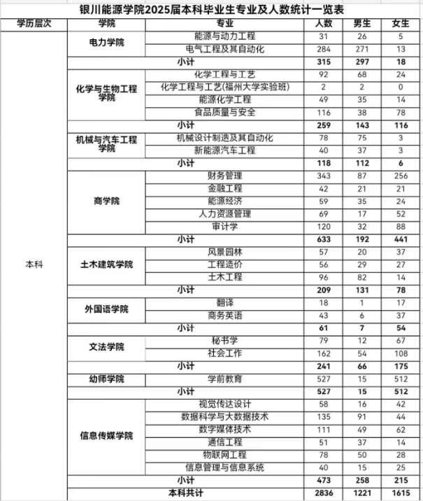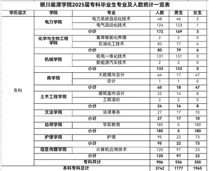 银川能源学院2026届生源信息 银川能源学院2026届毕业生共3572人,其中,女生1759人,男生1813人,详情见链接: 链接:银川能源学院2026届生源信息 银川能源学院2025届毕业生3742人,其中,本科毕业生2836人,专科毕业生906人,详情见下图: 推荐阅读银川能源学院就业指导中心联系方式宁夏生源信息查询系统