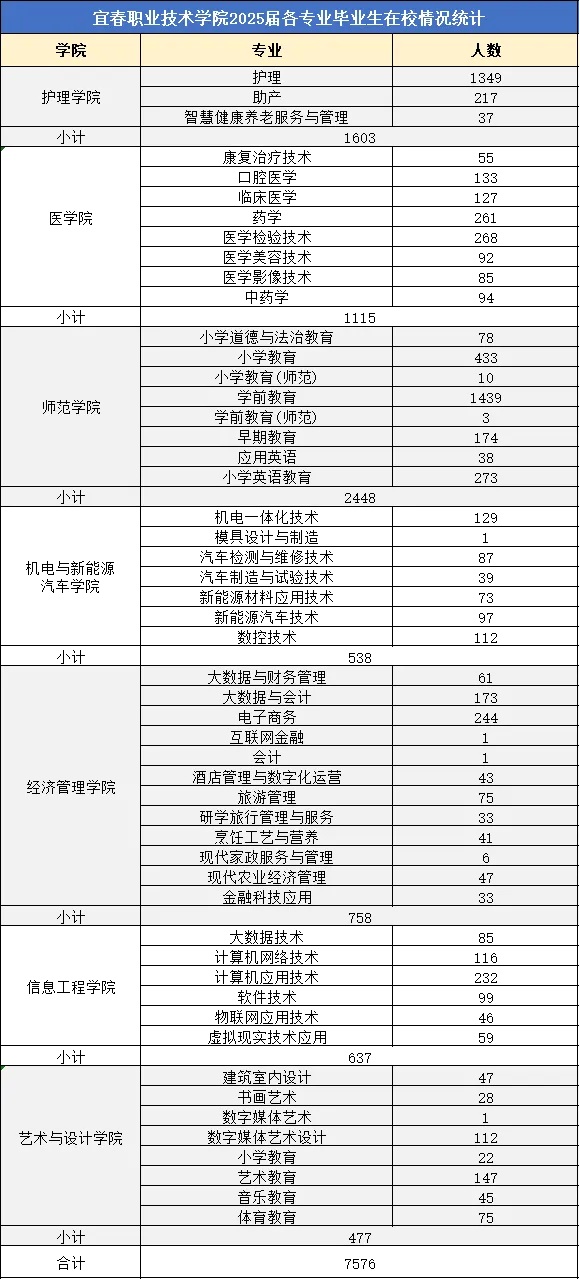 宜春职业技术学院2026届生源信息 链接:宜春职业技术学院2026届生源信息 宜春职业技术学院2025届毕业生共7576人,详情见下图: 推荐阅读宜春职业技术学院就业指导中心联系方式 江西生源信息查询系统
