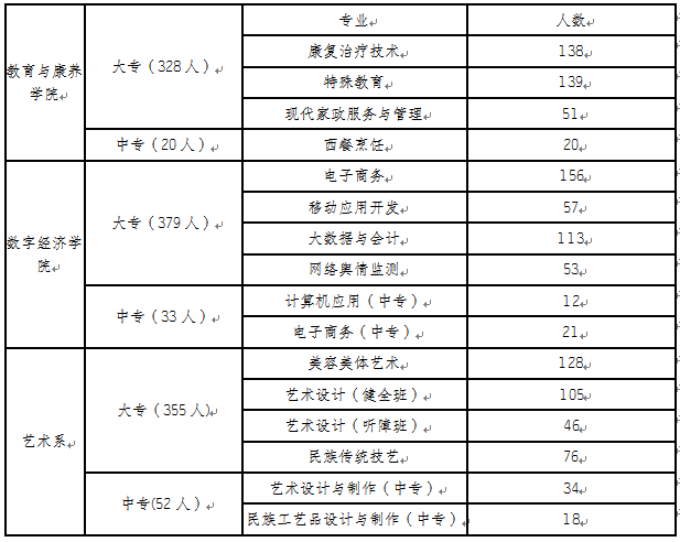 2026届大中专共有1001人,涉及特殊教育、康复治疗技术、现代家政服务与管理、电子商务、大数据与会计、网络舆情监测、移动应用开发、民族传统技艺、艺术设计、美容美体艺术、民族传统技艺、计算机应用专业等。