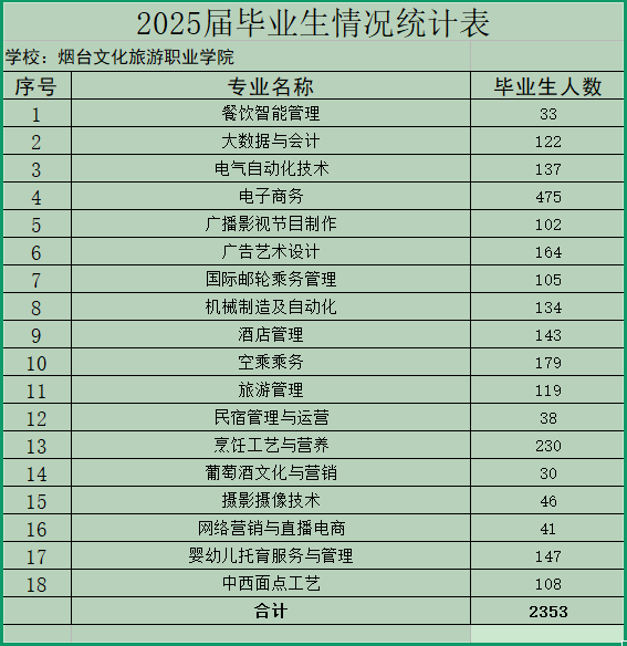 烟台文化旅游职业学院2025届毕业生共2353人,详情如下: