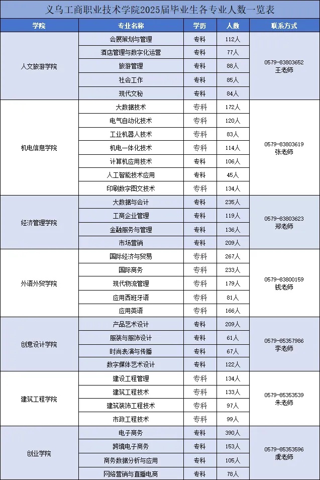 义乌工商职业技术学院2025届毕业生共4493人,详情见下图: