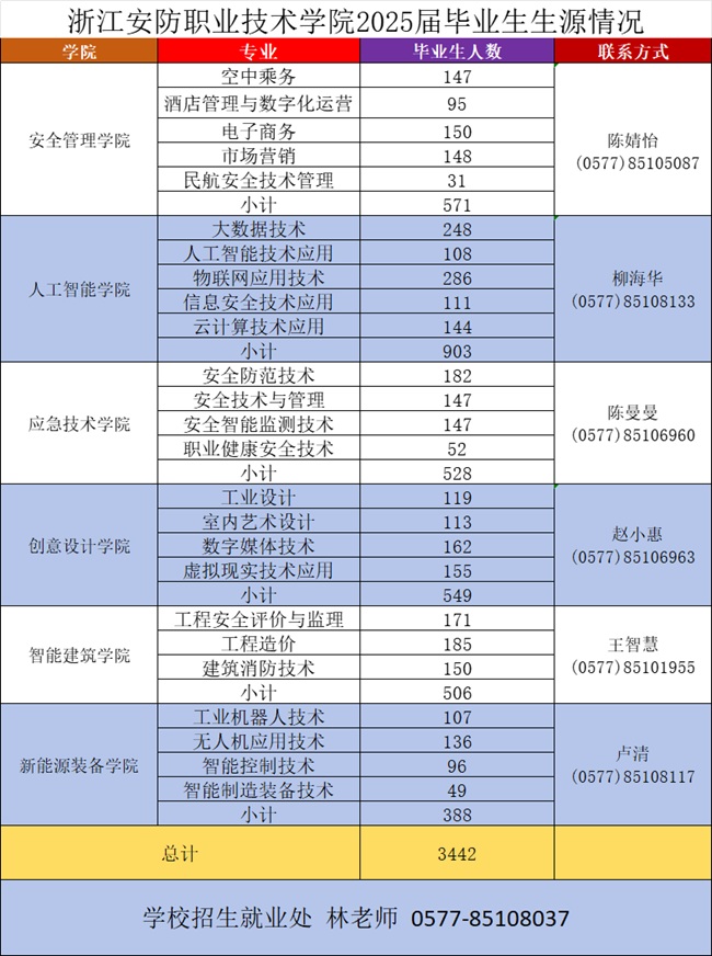 浙江安防职业技术学院2025届毕业生共3442人,详情见下图: